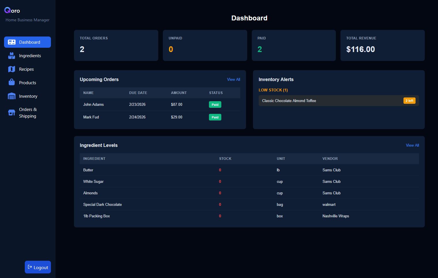 Qoro keeps your home business organised from raw ingredient to shipped order — inventory, recipes, orders, and customers in one quiet place.