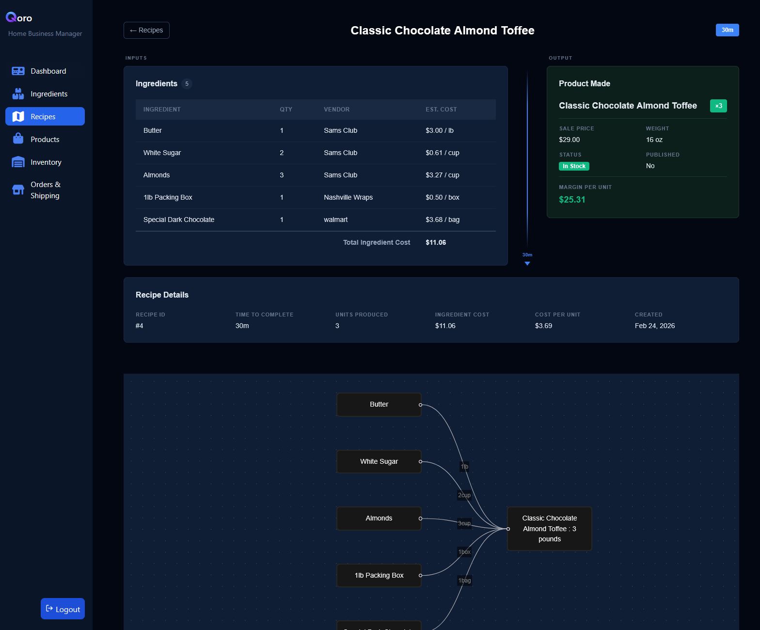 Build each recipe once. Qoro pulls in ingredient prices and tells you exactly what every unit costs to make.